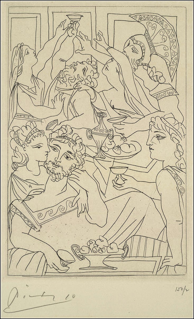 Lisístrata de Aristófanes en la versión inglesa de Gilbert Seldes, que apareció en Nueva York en 1934 publicada por una asociación de bibliófilos estadounidenses, en una edición reducida y exclusiva. Estas ilustraciones picassianas se caracterizan, dentro de la temática grecorromana y estilo clasicista que les es propio, por la simplicidad de líneas y por el equilibrio de la composición.